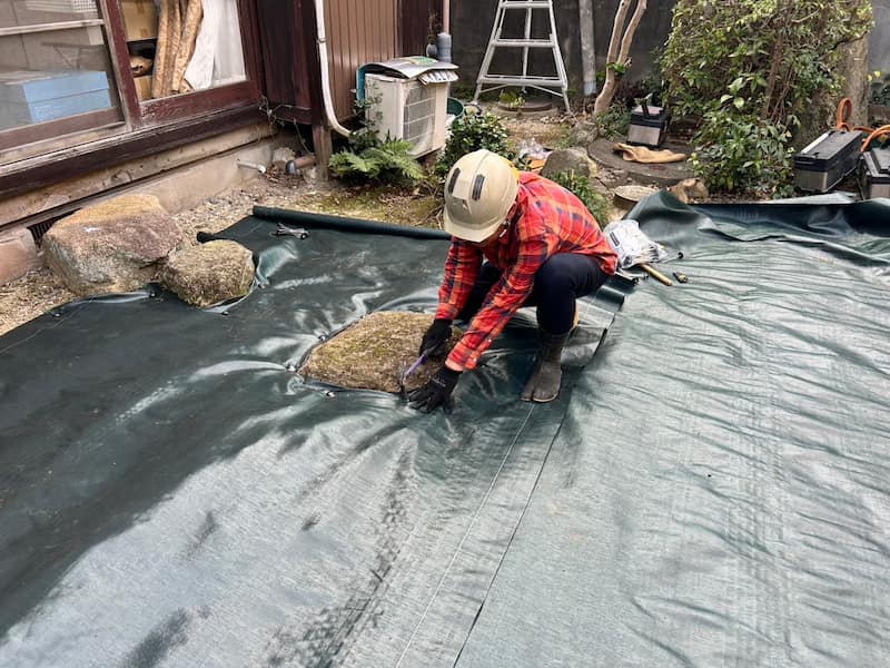お庭全体の下地も出来たのでお次は防草シートですね。